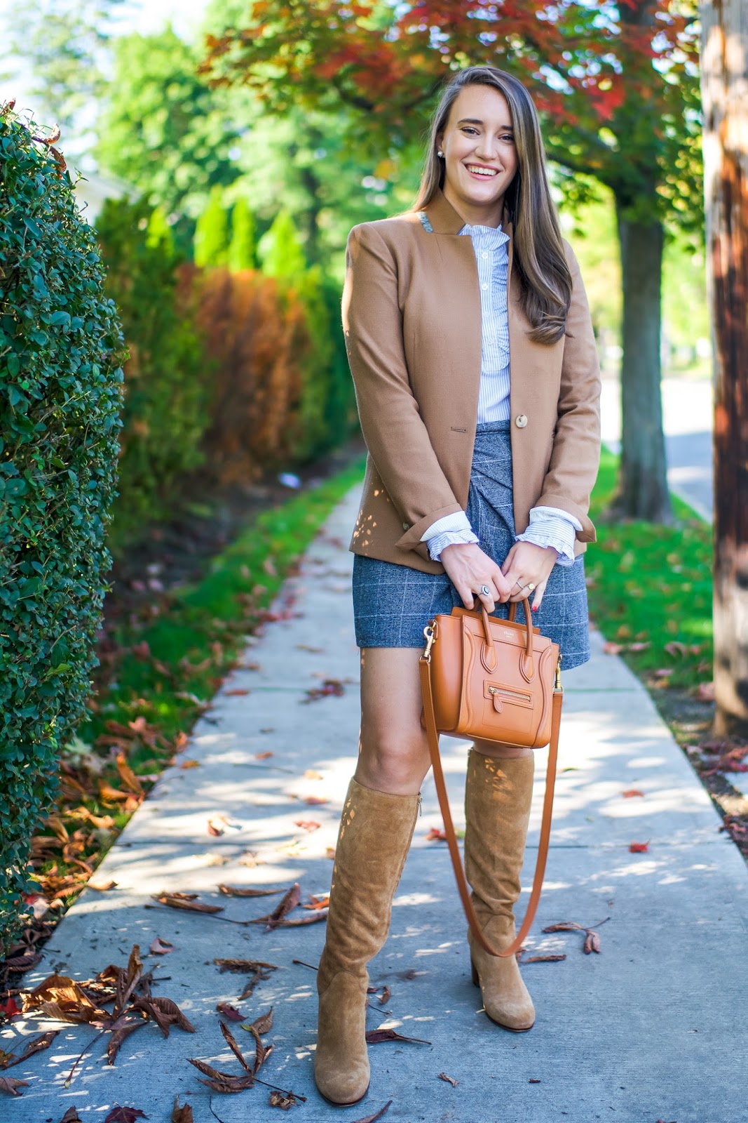 J. Crew: Regent Blazer (also HERE) / Kate Spade: Ruffle Neck Poplin Shirt / Leith: Plaid Wrap Skirt / Sam Edelman: Camellia Tall Boot / Celine: Nano Luggage / BabubleBar: Mini Monogram Necklace / David Yurman: Pearl Earrings / David Yurman: Cable Classics Band Ring / BaubleBar: Signet Ring